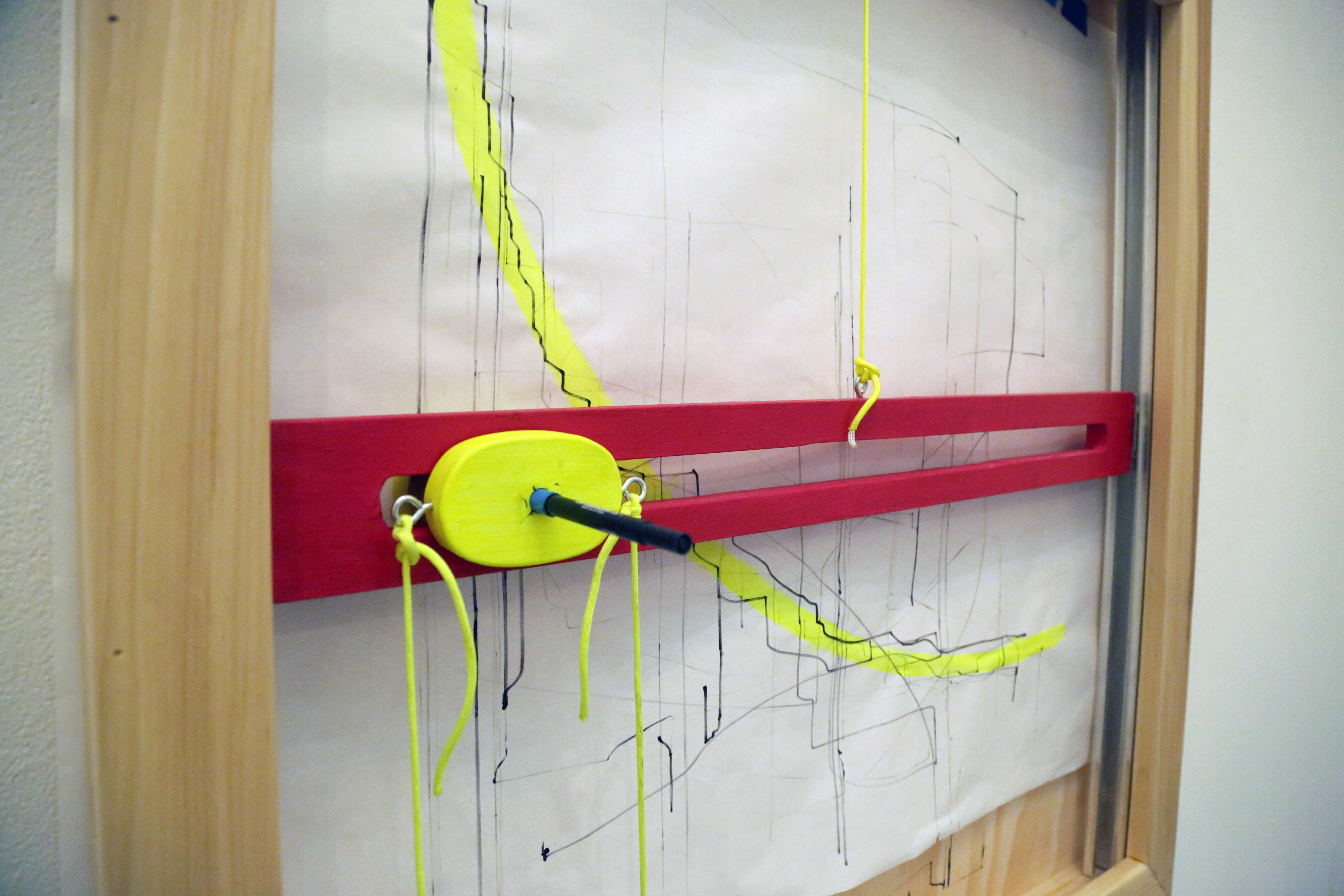 Project Overview: Created as a final project for my Drawing Machines class, the DrawMax 5000 developed out of my desire to design a machine that used the entire body to create a drawing. I drew inspiration from old fitness machines and athletic equipment to create a machine that requires users to engage in a wide range of motion as they “drew” on the wall. The machine itself moves similarly to an etch-a-sketch, naturally creating horizontal and vertical lines. There are two controllers for the machine, one is a chest harness the other a set of two handles. When users move together they create a drawing. The neon outlines on pages helped to encourage users to work together to coordinate their movements to create diagonal lines and even curves. This project aimed to ask users to consider the act of drawing as extending beyond the hand and into physical and collaborative space.